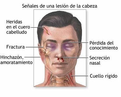 Además de las lesiones obvias como laceraciones del cuero cabelludo y hundimientos craneales pueden haber signos que pongan en la pista al médico de complicaciones importantes como hematoma en ojos de mapache, otorragia (sangre por el oído), etc.